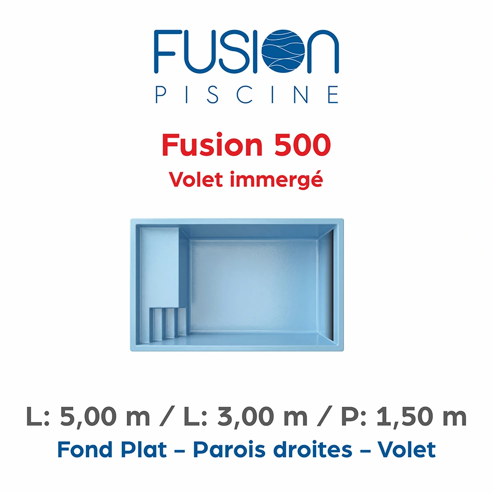 La Fusion 500 avec volet immergé est une piscine coque compacte conçue pour les jardins de taille moyenne. Ses parois droites offrent un volume de nage supérieur et un confort optimal. Le fond plat garantit sécurité et stabilité. L’escalier comprend 4 marches intégrées dans une plage de 90 cm pour un accès progressif et pratique. Le volet immergé assure une protection discrète et conforme aux normes de sécurité. La piscine est durable et facile à entretenir, adaptée à tous les usages familiaux.