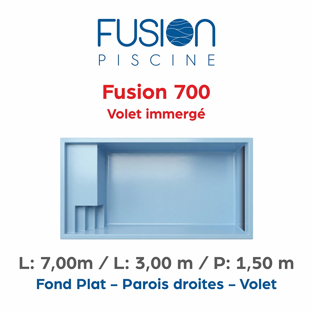 La Fusion 700 avec volet immergé est une piscine coque conçue pour les jardins de taille moyenne. Ses parois droites offrent un volume de nage supérieur et un confort optimal. Le fond plat garantit sécurité et stabilité. L’escalier comprend 4 marches intégrées dans une plage de 90 cm, assurant un accès progressif et sécurisé. Le volet immergé assure une protection discrète conforme aux normes de sécurité tout en préservant l’esthétique du bassin. Cette piscine est durable, facile à entretenir et parfaitement adaptée aux usages familiaux.
