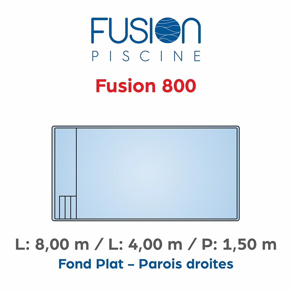 Avec ses dimensions de 8,00 x 4,00 m et une profondeur de 1,50 m, la Fusion 800 offre un vaste espace de nage. La longueur favorise les trajectoires larges pour une nage fluide et plaisante. La largeur améliore le confort des déplacements et des zones de détente. Les parois droites permettent également un aménagement efficace des plages autour du bassin.